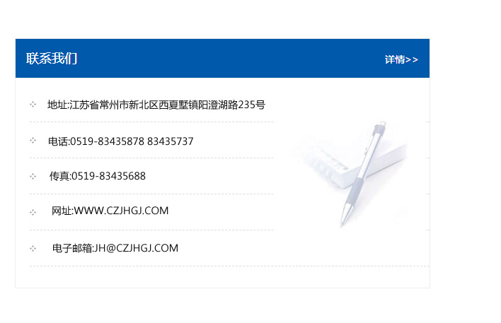 地址:常州市新北區友邦商務大廈1幢16、17層  電話:0519-85101652  傳真:0519-85112595  郵編:213022  網址:www.cz-jiayue_cn.jzqypx.com  郵箱:xiajifengaa@163.com